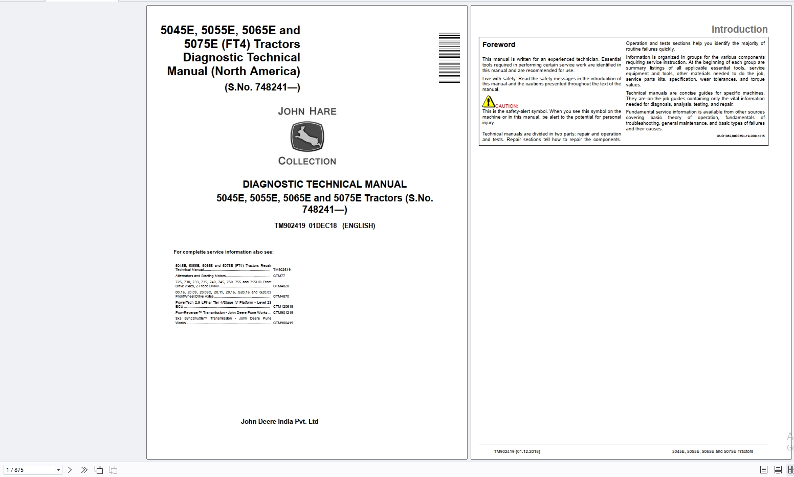 John Deere 5045E 5055E 5065E 5075E Tractor Diagnostic Technical Manual TM902419