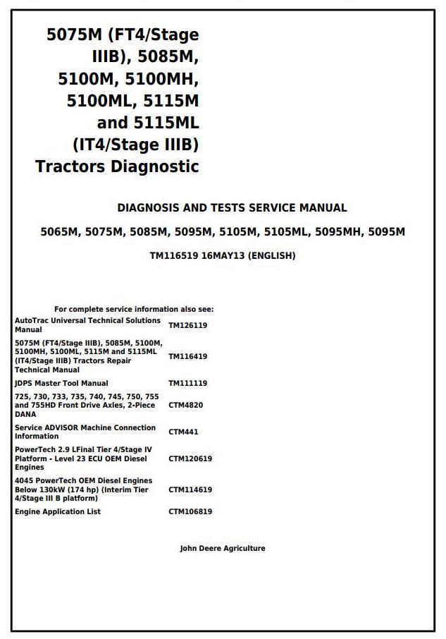 John Deere 5075M 5085M 5100M 5100MH 5100ML 5115M 5115ML Tractor Diagnosis Test Service Manual TM116519