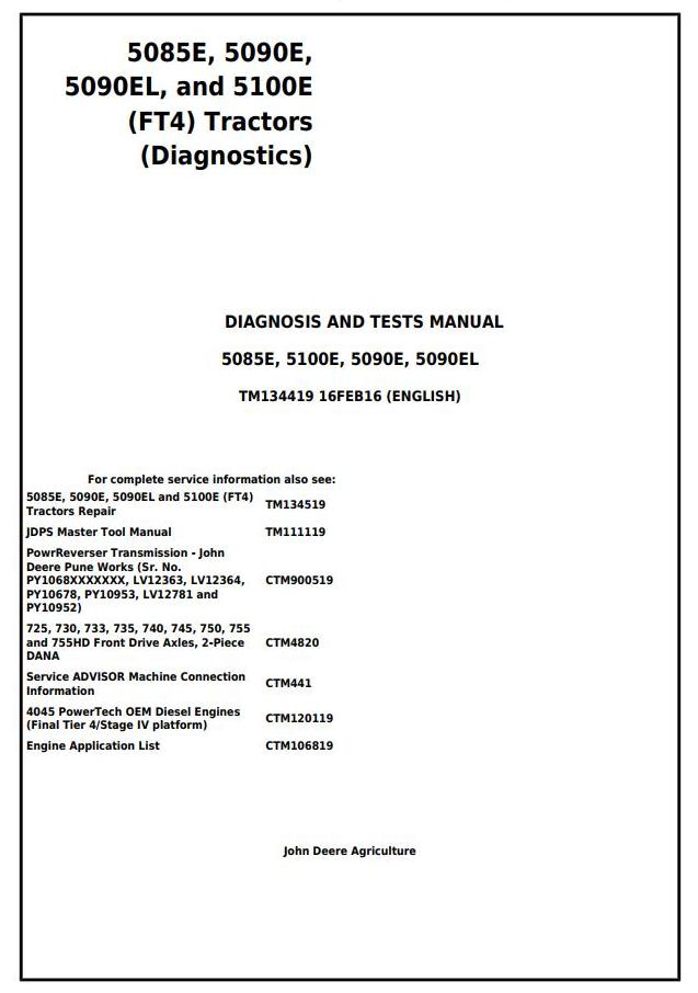 John Deere 5085E 5090E 5090EL 5100E (FT4) Tractor Diagnosis Test Manual TM134419
