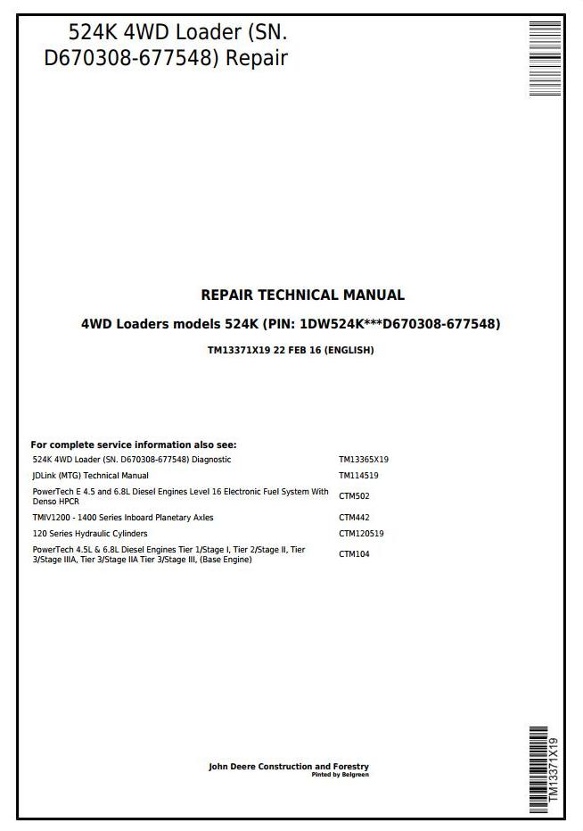 John Deere 524K 4WD Loader Repair Technical Manual TM13371X19