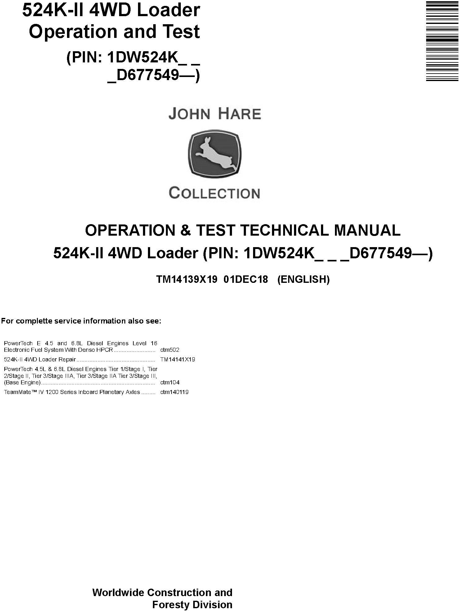 John Deere 524K-II 4WD Loader Operation Test Technical Manual TM14139X19