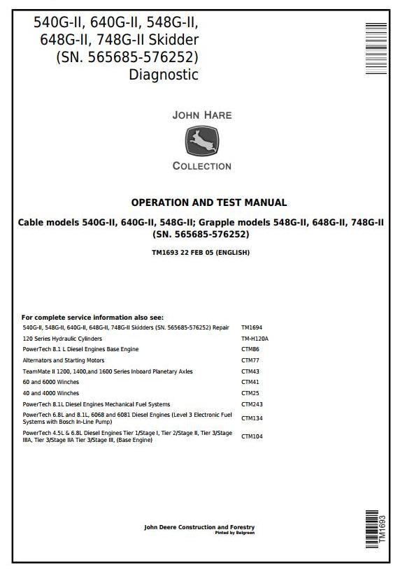 John Deere 540G-2 640G-2 548G-2 648G-2 748G-2 Skidder Diagnostic Operation Test Manual TM1693