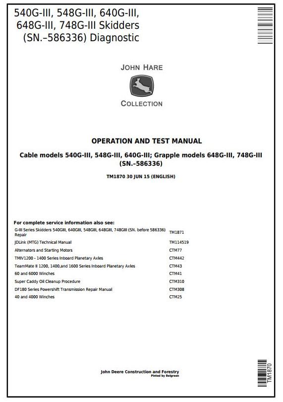 John Deere 540G-3 548G-3 640G-3 648G-3 748G-3 Skidder Diagnostic Operation Test Manual TM1870