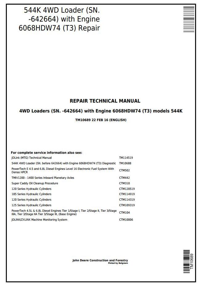 John Deere 544K 4WD Loader Repair Technical Manual TM10689