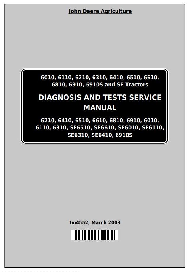 John Deere 6010 6110 6210 6310 6410 6510 6610 6810 6910 Tractor Diagnosis Test Service Manual TM4552