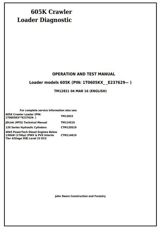 John Deere 605K Crawler Loader Diagnostic Operation Test Manual TM12821