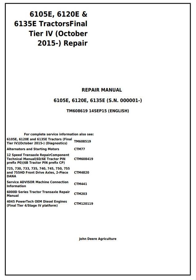 John Deere 6105E 6120E 6135E Tractor Repair Manual TM608619
