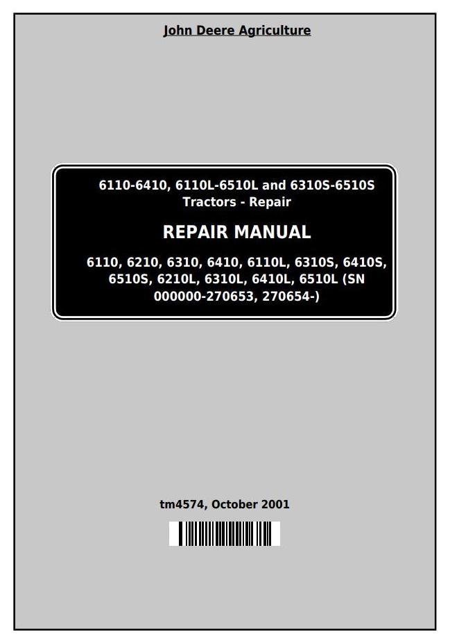 John Deere 6110 6110L 6210 6310 6310L 6310S 6410L 6410S 6510L 6510S Tractor Repair Manual TM4574