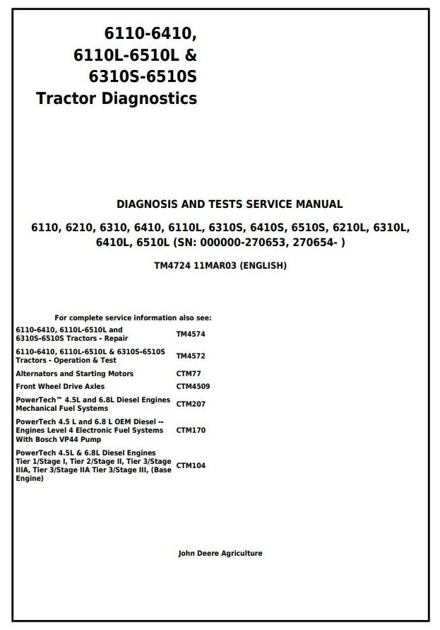 John Deere 6110 6210 6310 6410 6110L-6510L 6310S-6510S Tractor Diagnosis Test Service Manual TM4724