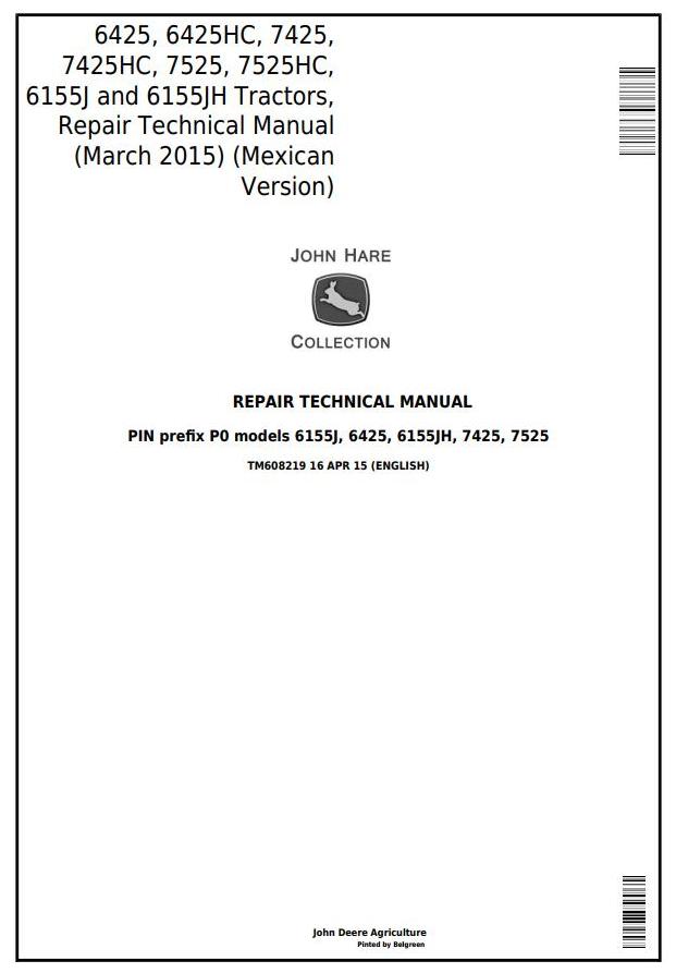 John Deere 6155J to 7525HC Tractor Repair Technical Manual TM608219