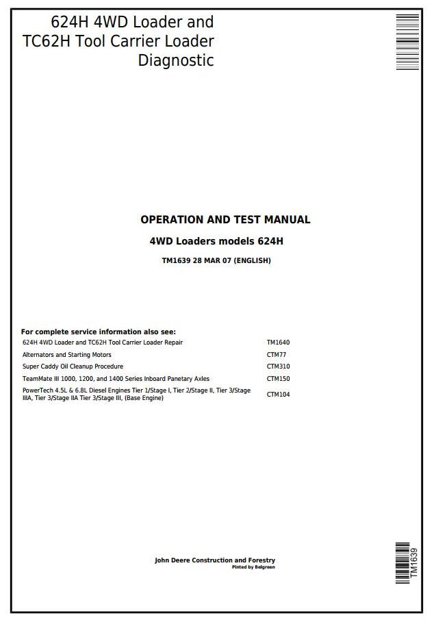 John Deere 624H 4WD TC62H Loader Tool Carrier Diagnostic Operation Test Manual TM1639