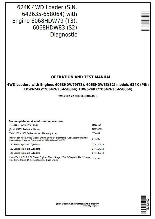 John Deere 624K 4WD Loader Diagnostic Operation Test Manual TM12102