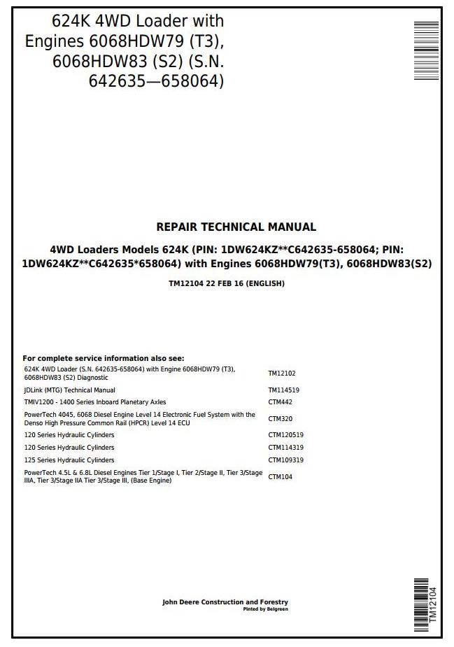 John Deere 624K 4WD Loader Repair Technical Manual TM12104