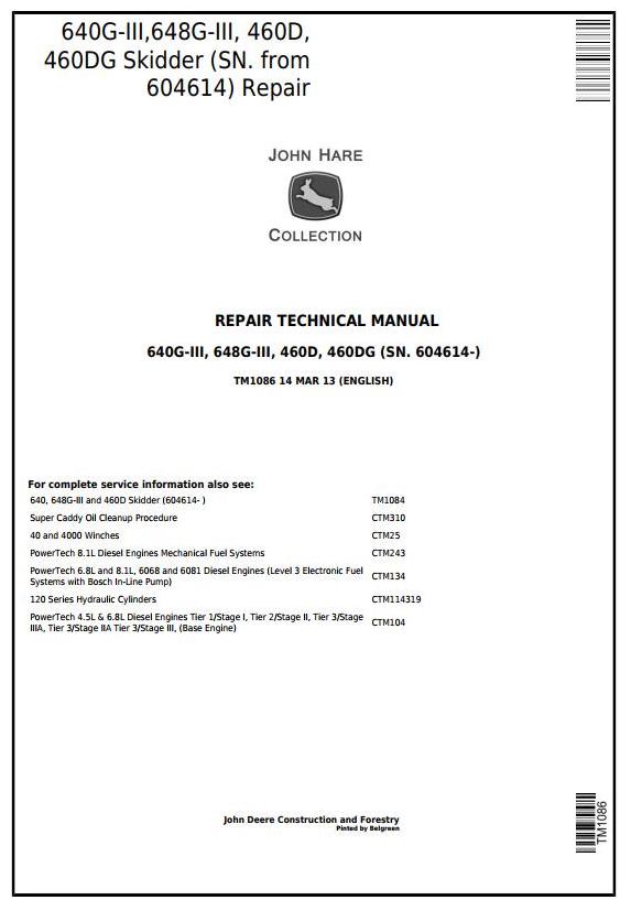 John Deere 640G-III 648G-III 460D 460DG Skidder Repair Technical Manual TM1086
