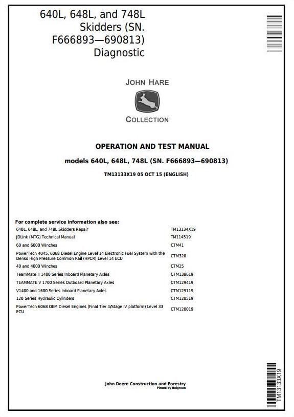 John Deere 640L 648L 748L Skidder Diagnostic Operation Test Manual TM13133X19