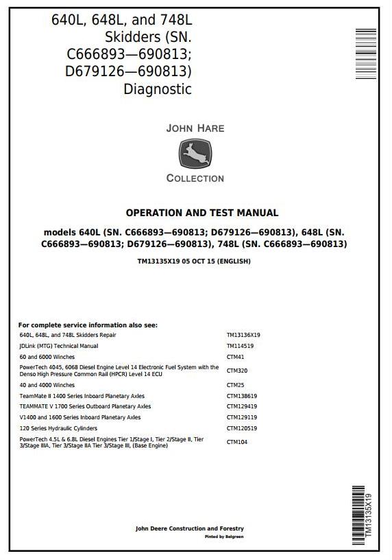 John Deere 640L 648L 748L Skidder Diagnostic Operation Test Manual TM13135X19