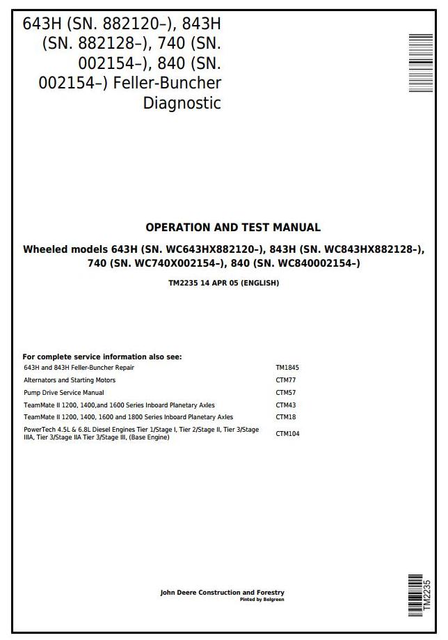 John Deere 643H 843H 740 840 Feller Buncher Diagnostic Operation Test Manual TM2235