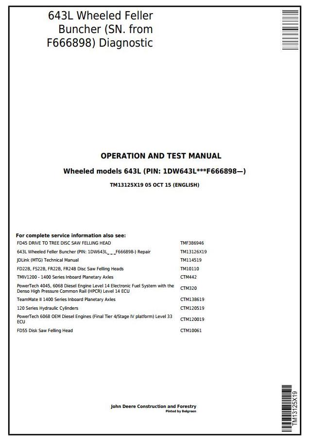 John Deere 643L Wheeled Feller Buncher Diagnostic Operation Test Manual TM13125X19