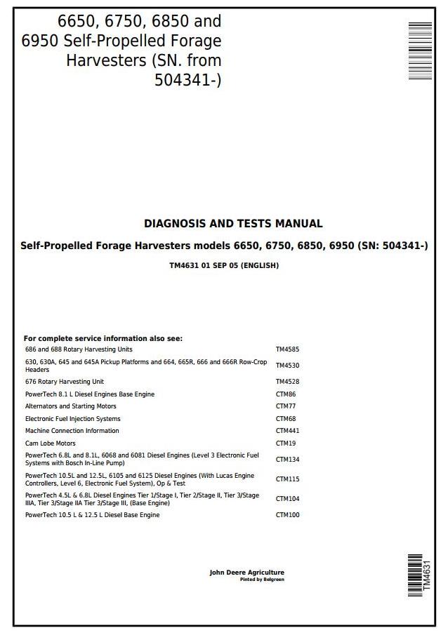John Deere 6650 6750 6850 6950 Self-Propelled Forage Harvester Diagnosis Test Manual TM4631