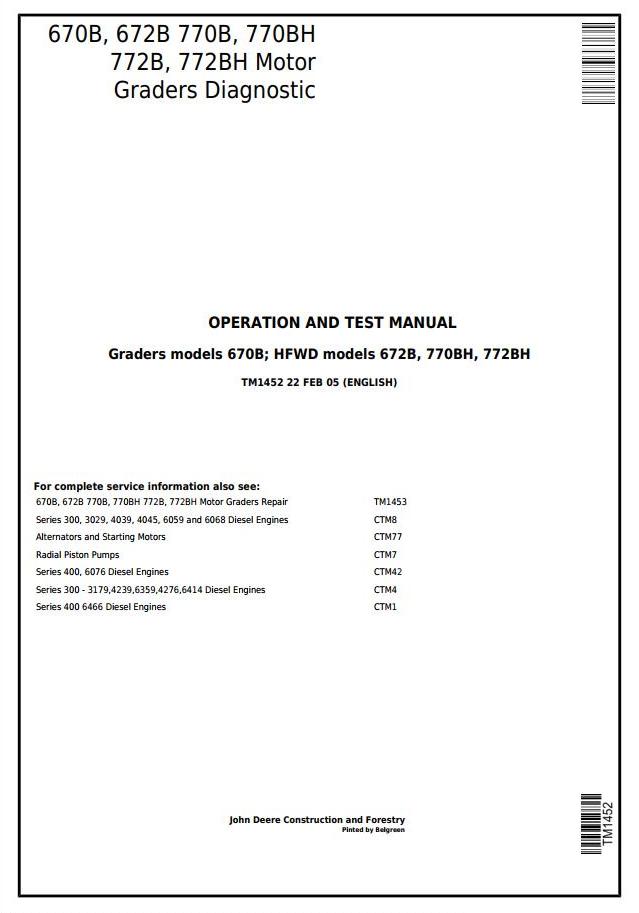 John Deere 670B 672B 770B 770BH 772B 772BH Motor Grader Diagnostic Operation Test Manual TM1452