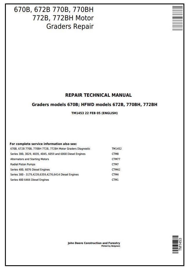 John Deere 670B 672B 770B 770BH 772B 772BH Motor Grader Repair Technical Manual TM1453