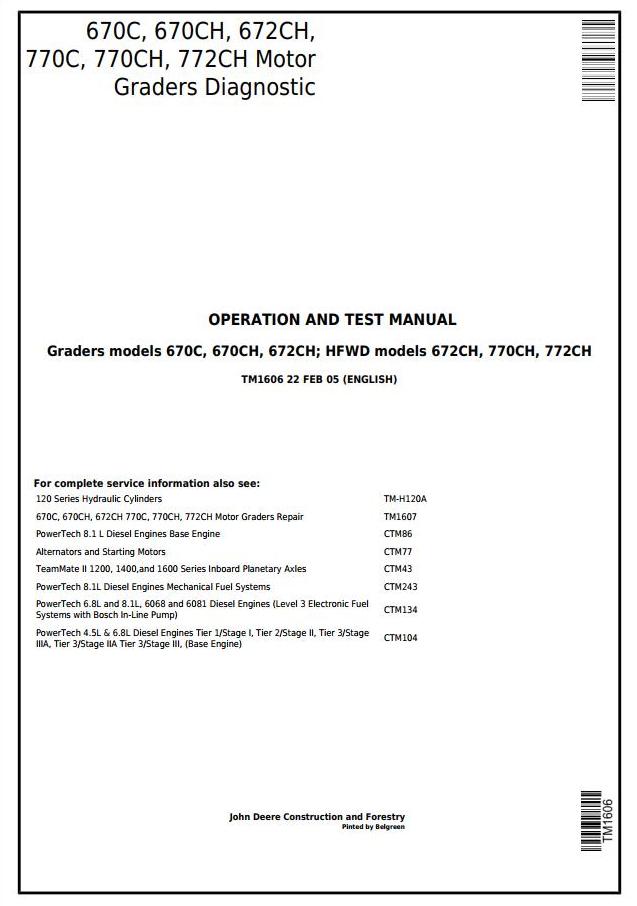 John Deere 670C 670CH 672CH 770C 770CH 772CH Motor Grader Diagnostic Operation Test Manual TM1606