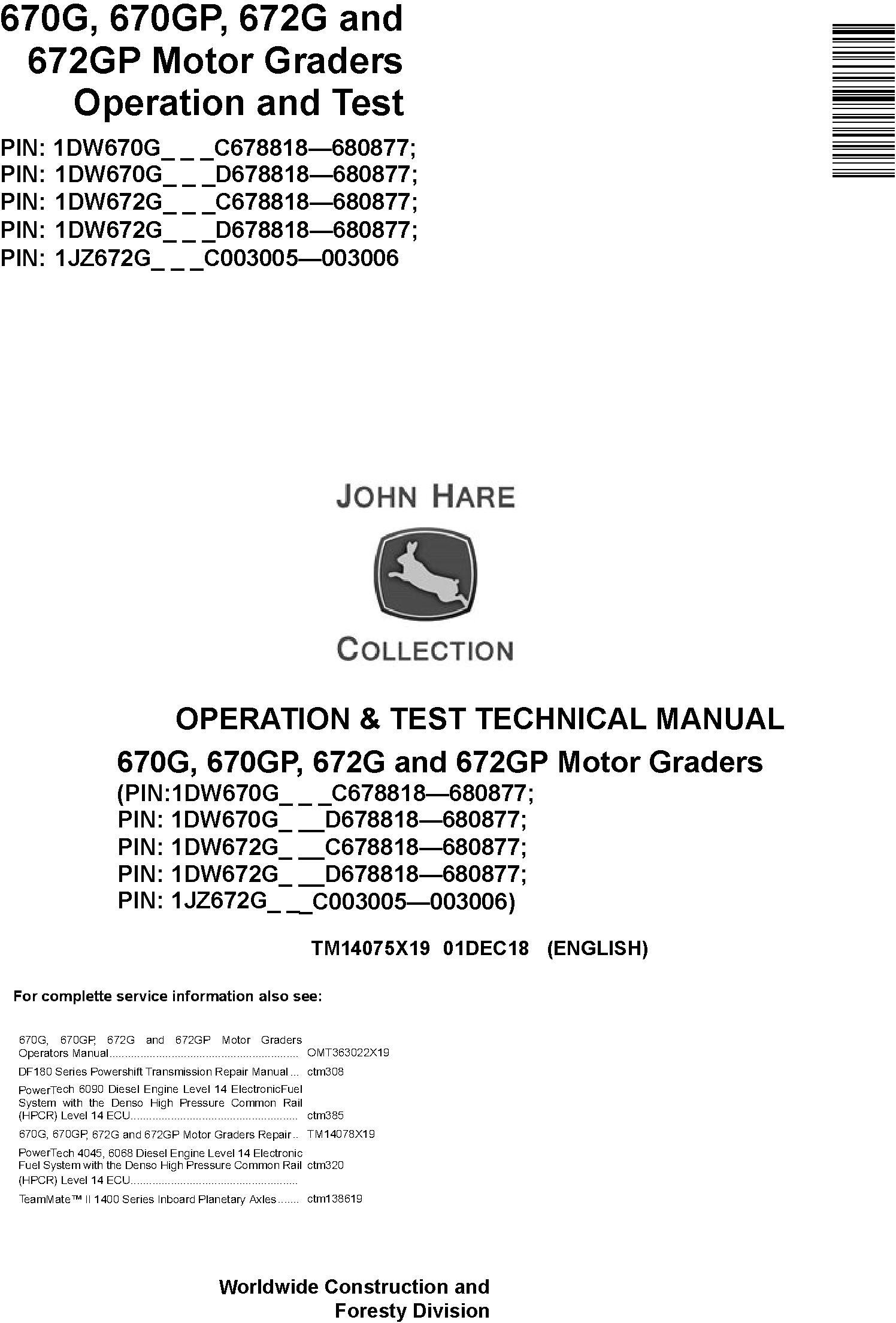 John Deere 670G 670GP 672G 672GP Motor Grader Operation Test Technical Manual TM14075X19