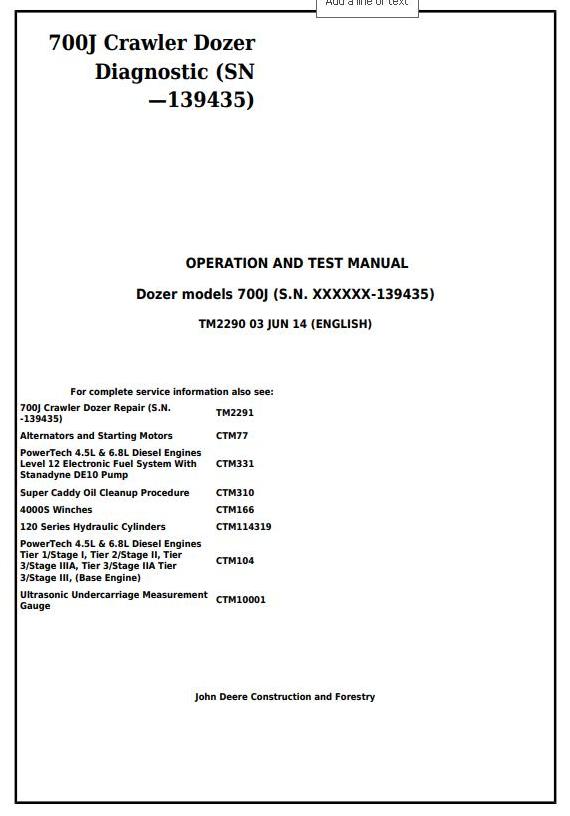 John Deere 700J Crawler Dozer Diagnostic Operation Test Manual TM2290