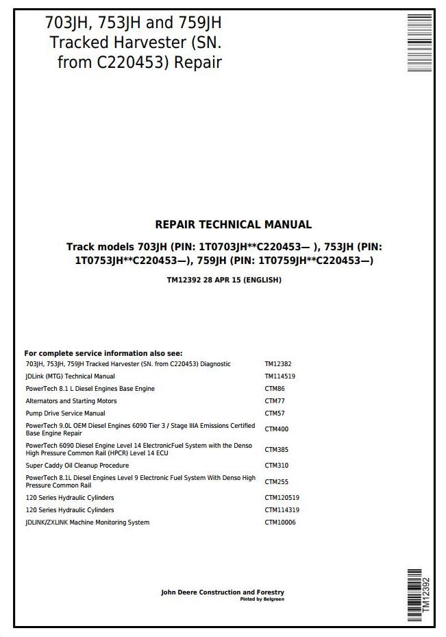 John Deere 703JH 753JH 759JH Tracked Harvester Repair Technical Manual TM12392