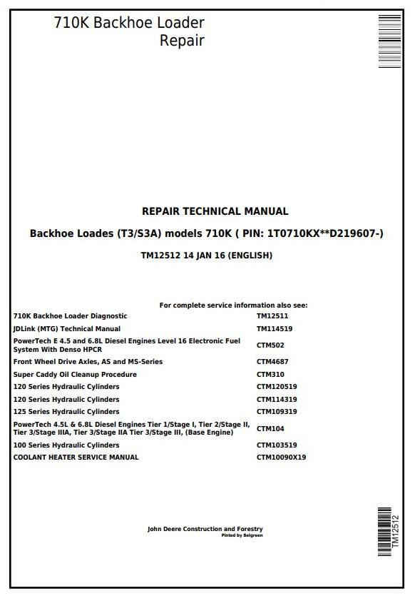 John Deere 710K Backhoe Loader Repair Technical Manual TM12512