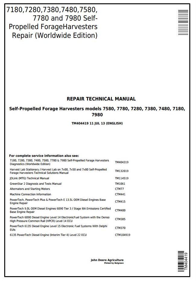 John Deere 7180 to 7980 Self-Propelled Forage Harvester Repair Manual TM404419