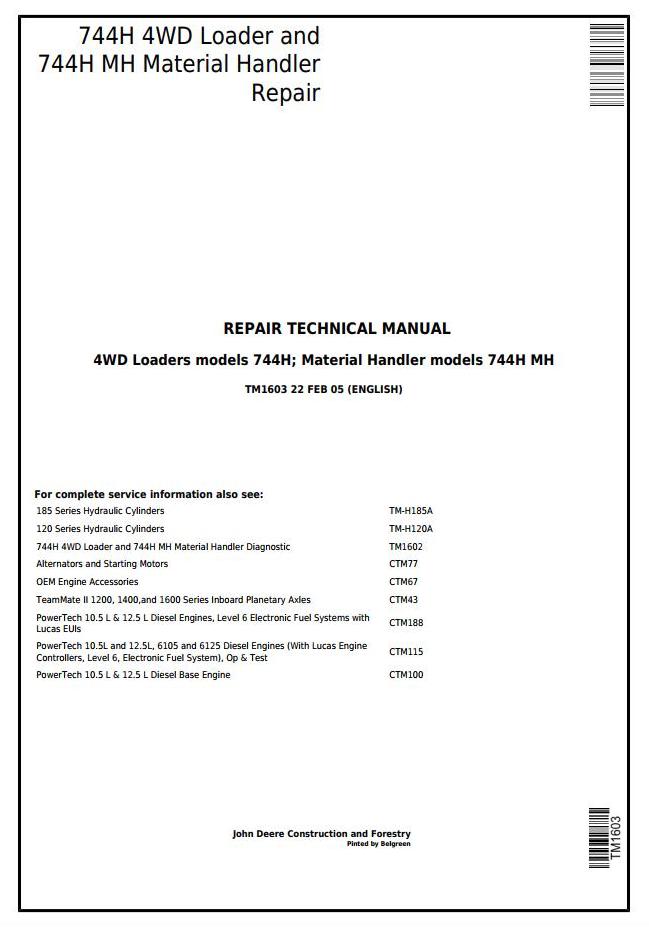 John Deere 744H 4WD 744H MH Loader Material Handler Repair Technical Manual TM1603