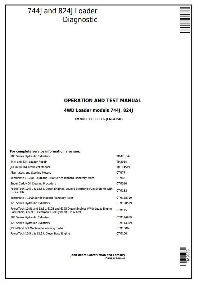 John Deere 744J 824J 4WD Loaders Diagnostic Operation Test Manual TM2083