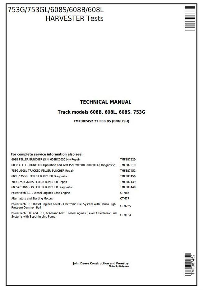 John Deere 753G 753GL 608S 608B 608L Track Harvester Test Technical Manual TMF387452