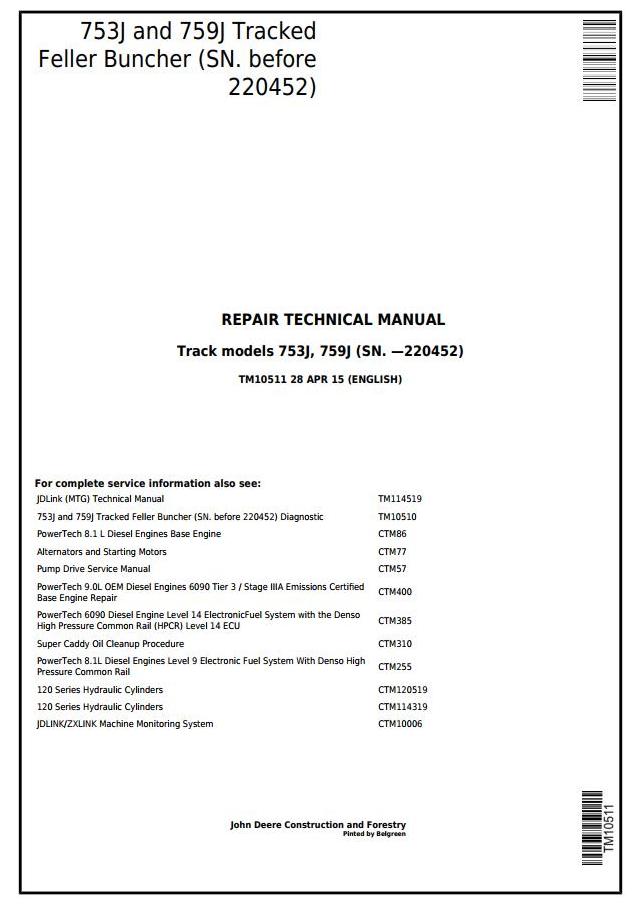 John Deere 753J 759J Tracked Feller Buncher Repair Technical Manual TM10511