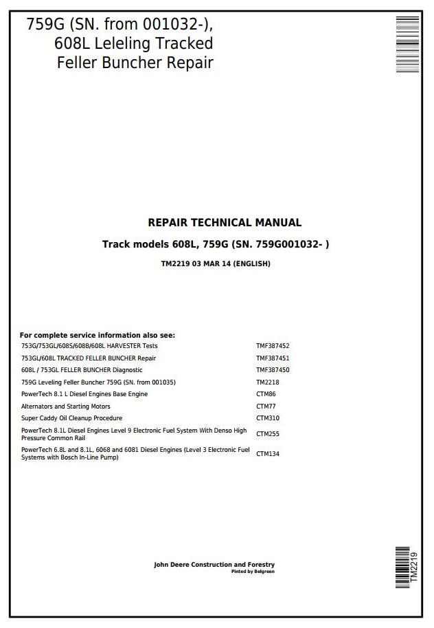John Deere 759G 608L Leveling Tracked Feller Buncher Repair Technical Manual TM2219