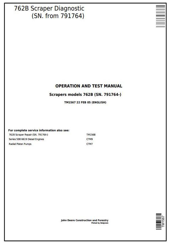 John Deere 762B Scraper Operation Test Manual TM1567