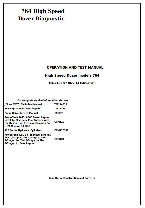 John Deere 764 High Speed Dozer Diagnostic Operation Test Manual TM11192