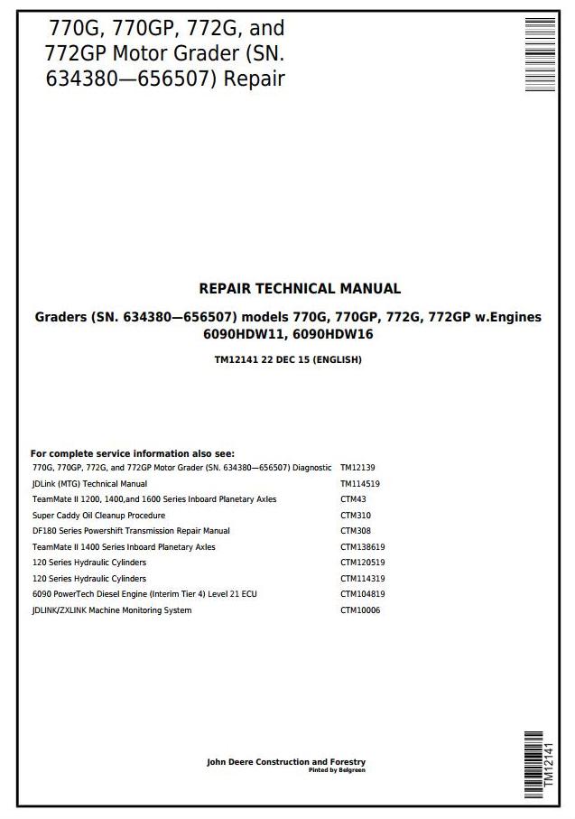 John Deere 770G 770GP 772G 772GP Motor Grader Repair Technical Manual TM12141
