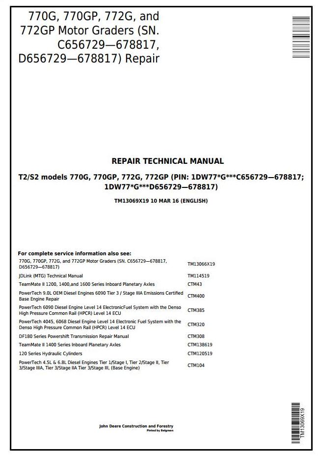 John Deere 770G 770GP 772G 772GP Motor Grader Repair Technical Manual TM13069X19