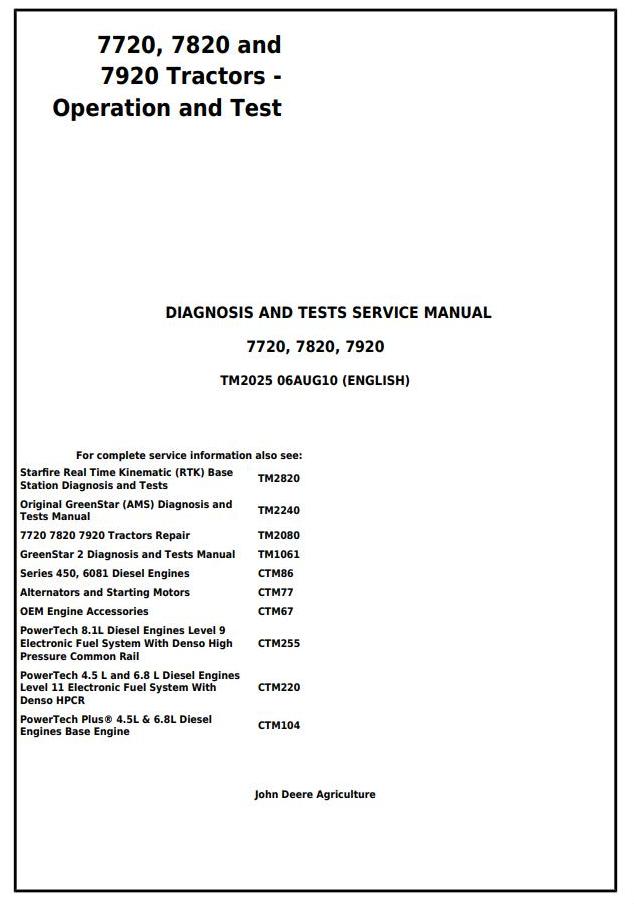 John Deere 7720 7820 7920 Tractor Operation Diagnosis Test Service Manual TM2025