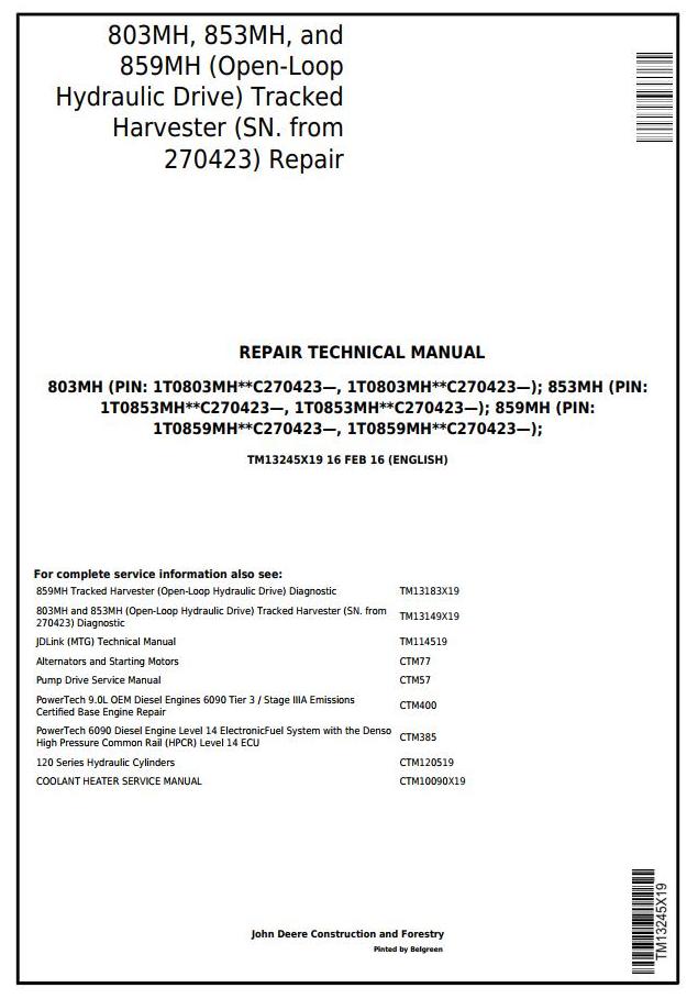 John Deere 803MH 853MH 859MH Tracked Harvester Repair Technical Manual TM13245X19