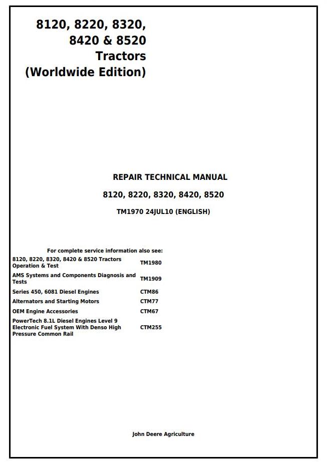 John Deere 8120 8220 8320 8420 8520 Worldwide Edition Tractor Repair Technical Manual TM1970