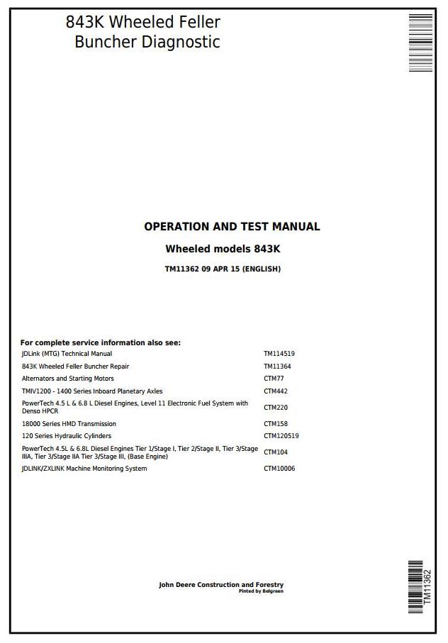 John Deere 843K Wheeled Feller Buncher Diagnostic Operation Test Manual TM11362