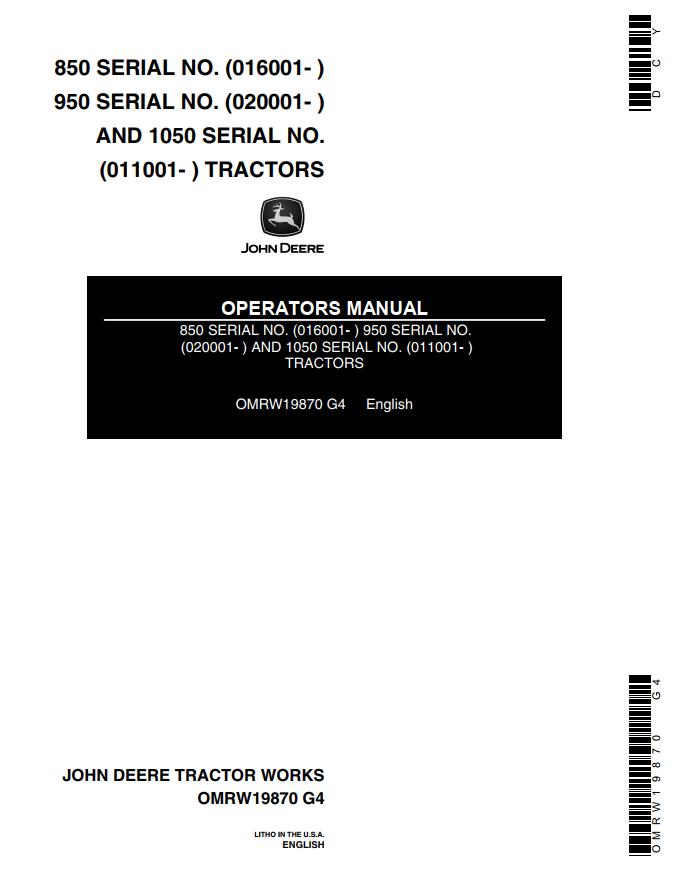 John Deere 850 950 1050 Operators Manual OMRW19870