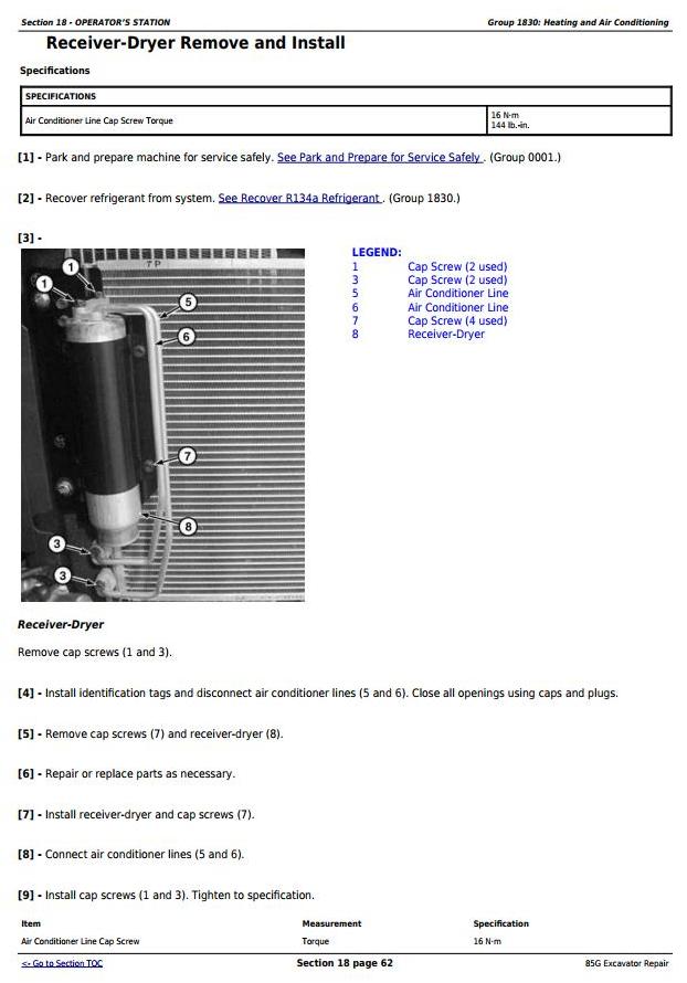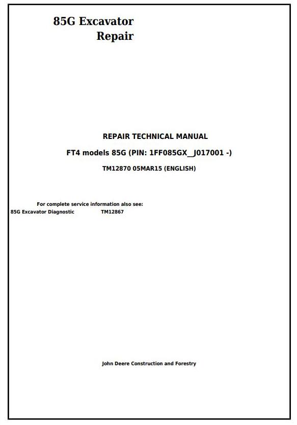 John Deere 85G Excavator Repair Technical Manual TM12870
