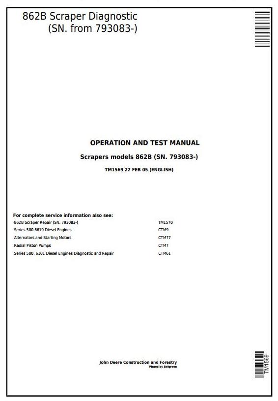 John Deere 862B Scraper Operation Test Manual TM1569