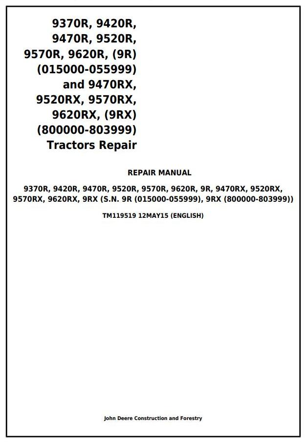 John Deere 9370R to 9620R 9470RX 9520RX 9570RX 9620RX Tractor Repair Manual TM119519