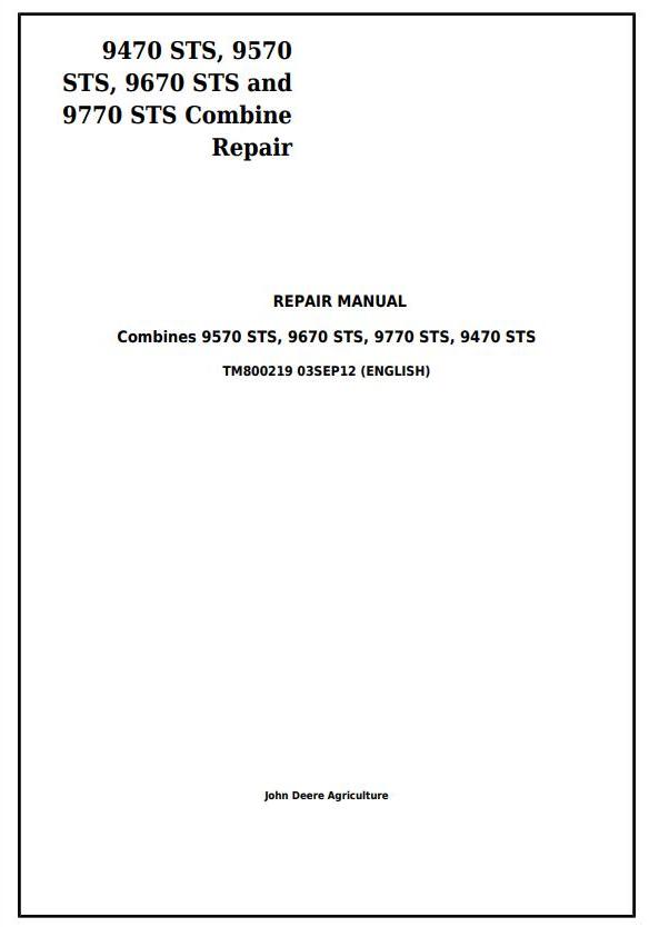 John Deere 9470STS 9570STS 9670STS 9770STS Combine Repair Manual TM800219