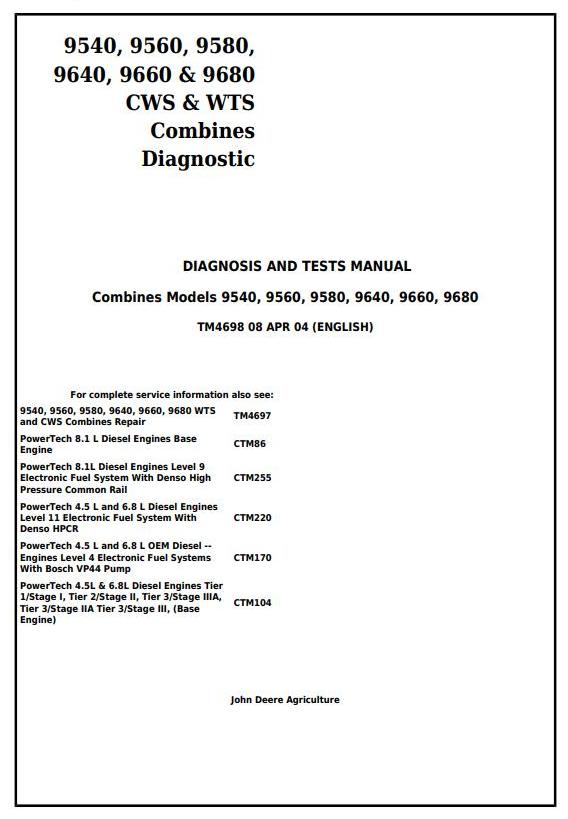 John Deere 9540 9560 9580 9640 9660 9680 CWS WTS Combine Diagnosis Test Manual TM4698